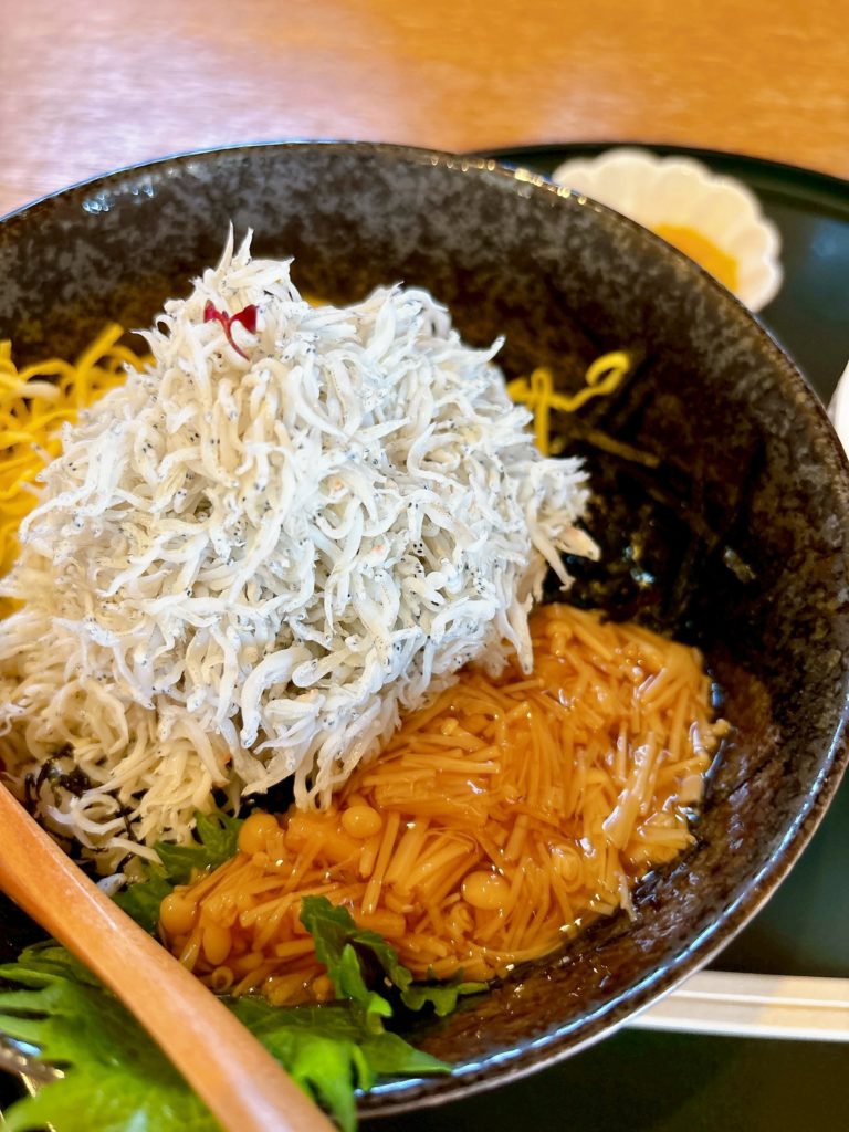 お昼はしらす丼食べて、目的地の白崎海洋公園へ