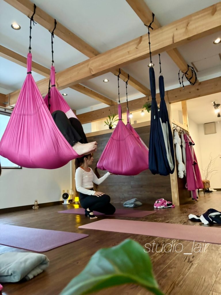 Lairではシルクサスペンションのレッスンの最後にスリングの中でお休みする時間を作っています。