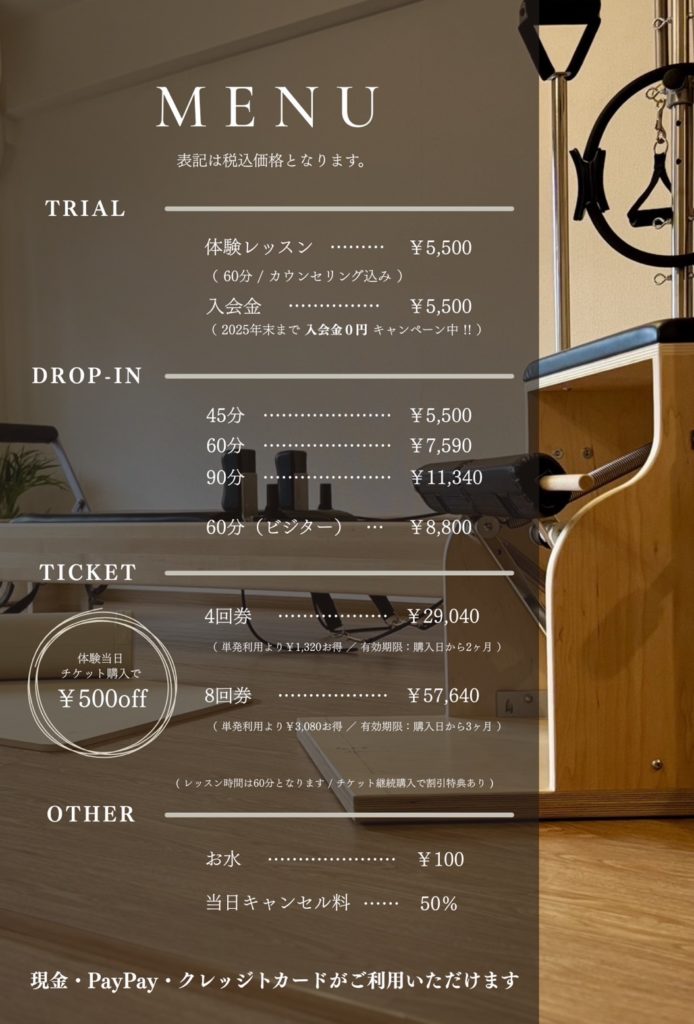 キャンセル料:体験→\2,500 45分→\2,750 60分→\3,500 ロング→\5,000