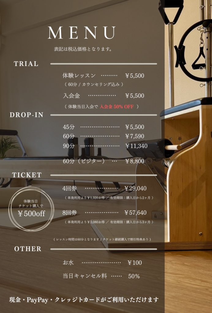 リフォーマー・チェアを使ったエクササイズとマットピラティスを組み合わせながらレッスンをさせていただきます。