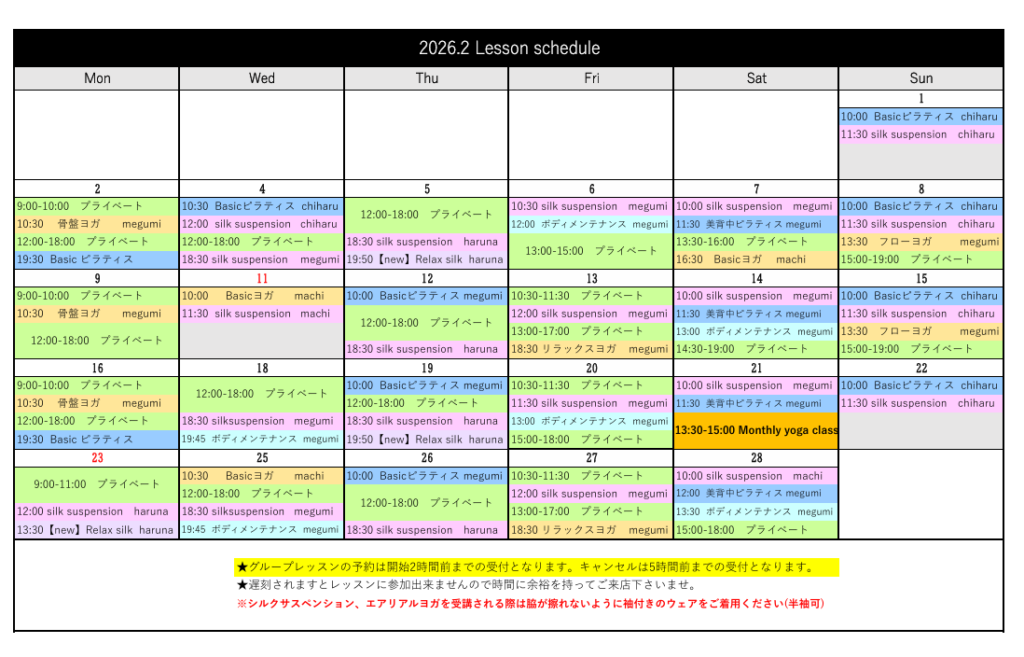 レッスン開始10分前にスタジオへお越し下さい。 レッスン前にスタジオご利用に関してご案内させていただきます